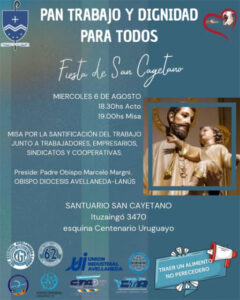 julio 31, 2025La comunidad religiosa de Avellaneda-Lanús se prepara para rendir homenaje a San Cayetano, patrono del pan y del trabajo. El próximo miércoles 6 de agosto a las 19:00 horas, el Padre Obispo Marcelo Margni presidirá la tradicional misa por la Santificación del Trabajo. El encuentro se llevará a cabo en el Santuario San Cayetano, ubicado en Ituzaingó 3470, esquina Centenario Uruguayo, en Lanús.
